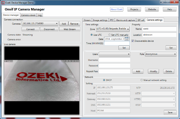 On the 'Camera settings' tab you can configure a lot of properties of your IP camera like time, name, location, users, network. The most of them speak for themselves, but some of them are more complicated functions e.g. if you check out the 'Discoverable device' in the 'Property' section, nobody will see the IP camera on the network (apart from this, you will be able to reach it). Furthermore, you can add users and roles for the scope of the IP camera users. This will authenticate the users based on their usernames and passwords. In the network settings you can set the network addresses manually or automatically (DHCP) (Figure 10).