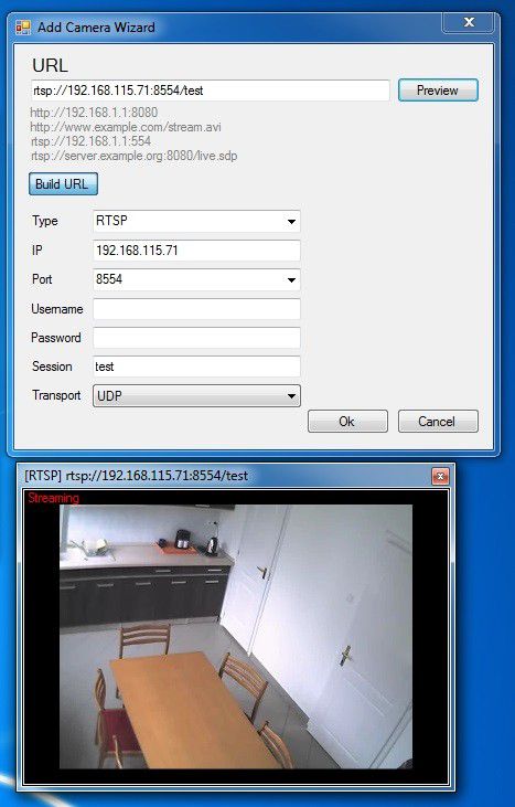 In the Add Camera Wizard window click the Build URL button, and you can customize the url and the transport layer protocol (UDP or TCP). The transport layer protocol is very important, if you can't connect to the stream you can try to switch the protocol.